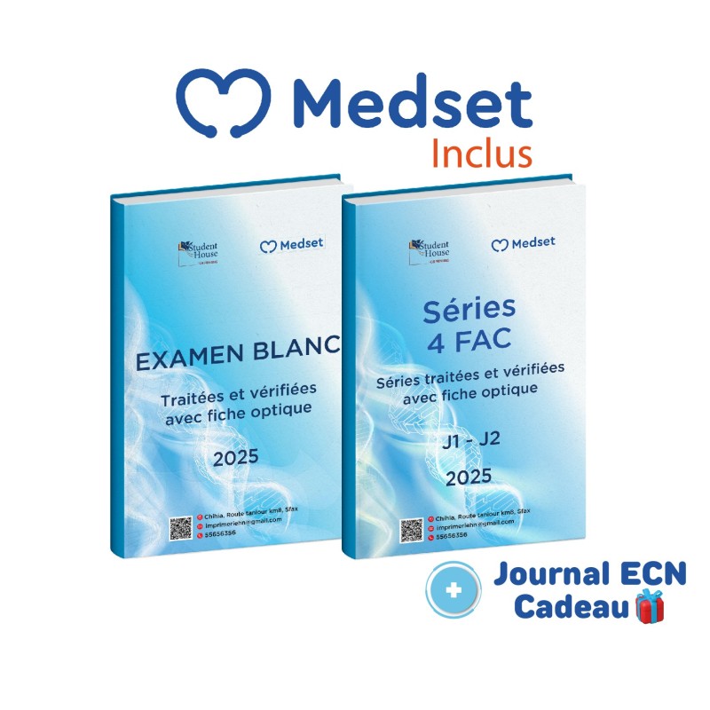 "Le pack séries 2025 , regroupant des séries traitées et vérifiées des quatre facultés pour l'année 2025 avec des fiches optiques similaires à celles du concours de résidanat, est accompagné des examens blancs correspondants pour les quatre facultés. vous bénéficiez d'un accès illimité et exclusif à MEDSET, la première application mobile en Tunisie dédiée à la préparation du concours de résidanat en médecine. N'hésitez pas à passer votre commande dès maintenant pour profiter d'une remise avantageuse .