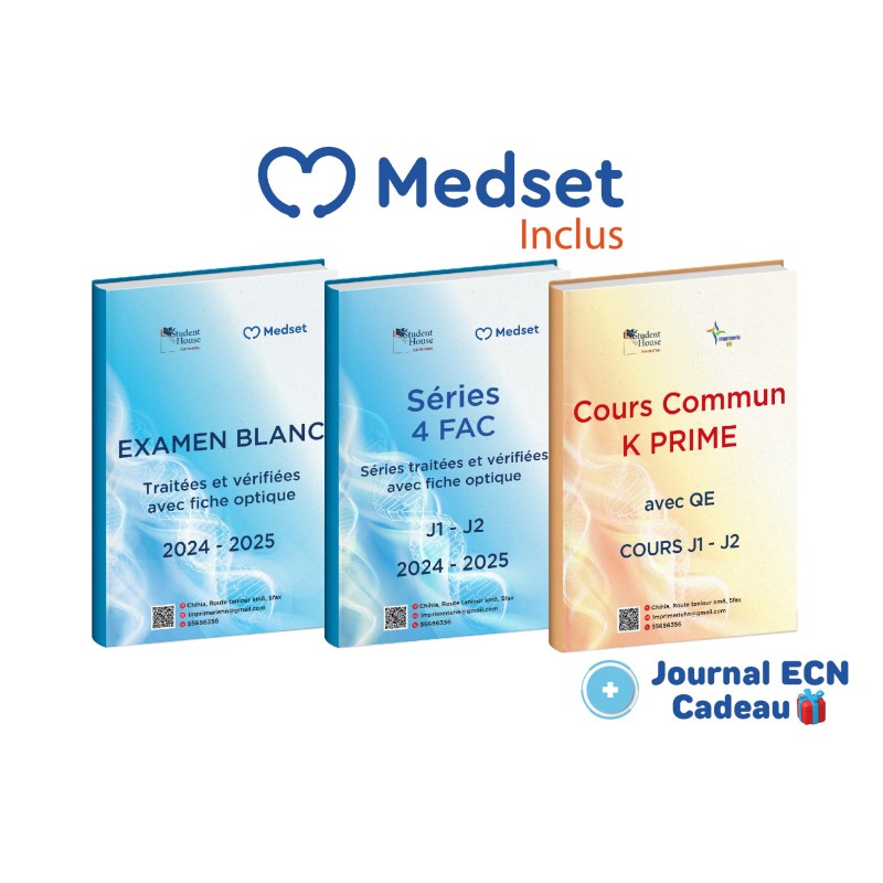 Le pack K PRIME 2 ans , regroupant des séries traitées et vérifiées des quatre facultés des deux dernières années (2024/2025) avec des fiches optiques similaires à celles du concours de résidanat, est accompagné des examens blancs correspondants pour les quatre facultés. En plus des cours K PRIME avec QE, vous bénéficiez d'un accès illimité et exclusif à MEDSET, la première application mobile en Tunisie dédiée à la préparation du concours de résidanat en médecine. N'hésitez pas à passer votre commande dès maintenant pour profiter d'une remise avantageuse .