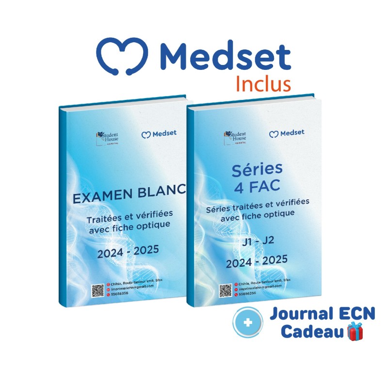 "Le pack séries 2 ans , regroupant des séries traitées et vérifiées des quatre facultés des deux dernières années (2024/2025) avec des fiches optiques similaires à celles du concours de résidanat, est accompagné des examens blancs correspondants pour les quatre facultés. vous bénéficiez d'un accès illimité et exclusif à MEDSET, la première application mobile en Tunisie dédiée à la préparation du concours de résidanat en médecine. N'hésitez pas à passer votre commande dès maintenant pour profiter d'une remise avantageuse .